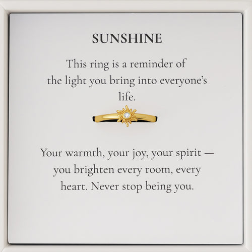 Simboliza tu amor y aprecio con elAnillo Sunshine — elaborado en plata de ley y presentado en una caja de regalo premium. Inspirado en la frase “Eres mi sol,”este anillo es un recordatorio simple del calor y la alegría que alguien especial aporta a tu vida. Una pieza significativa hecha para celebrar la luz que traen a tu día a día.