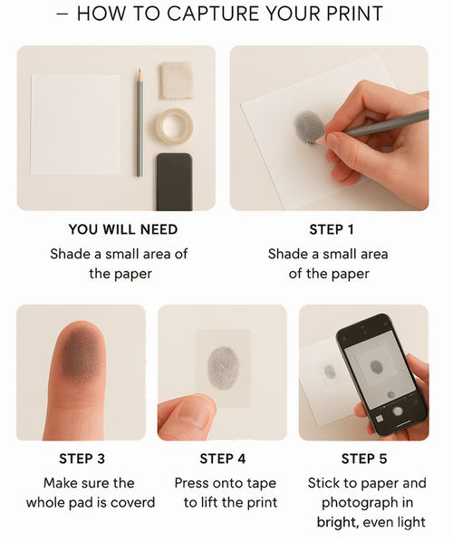 Sigue nuestra guía de 5 pasos para transferir la huella dactilar a papel blanco usando un lápiz y cinta adhesiva transparente.