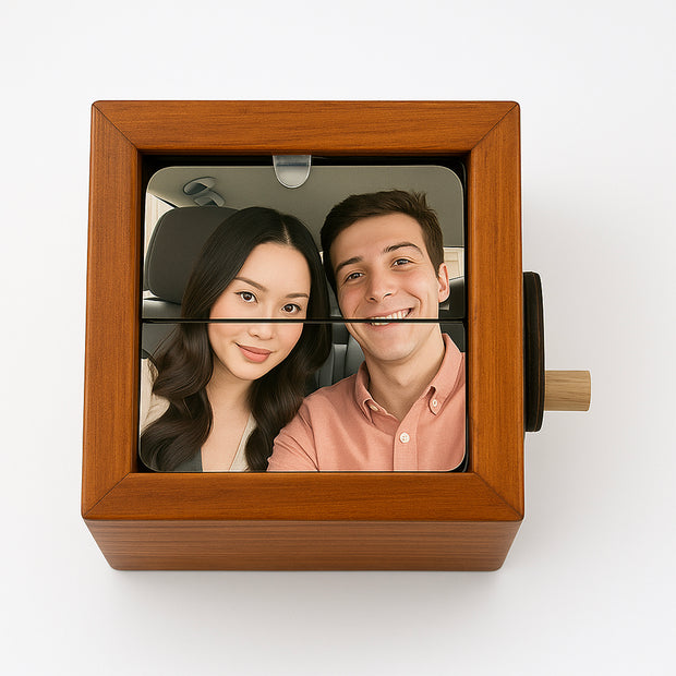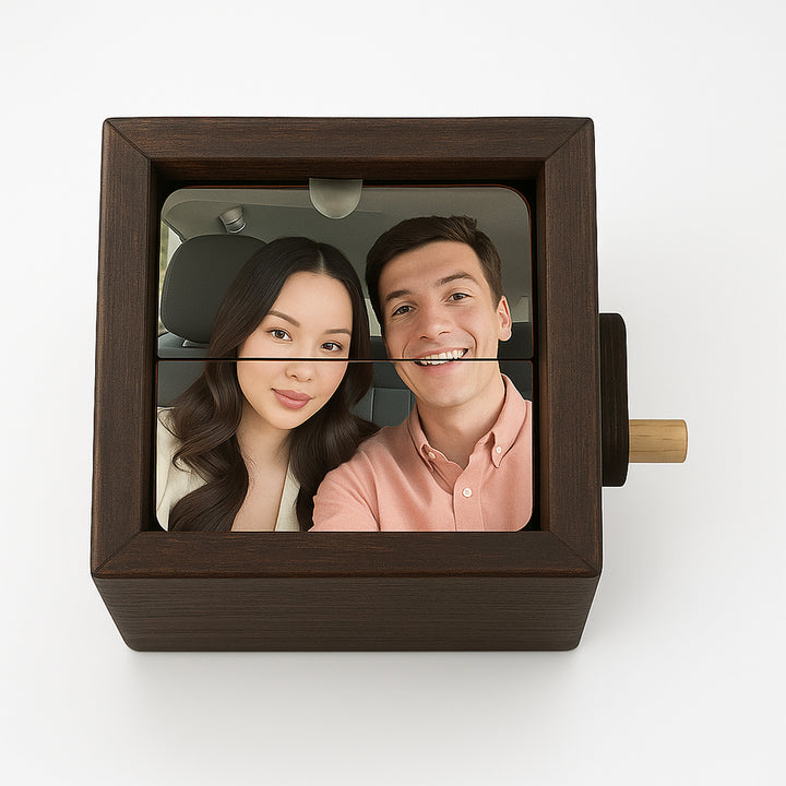Chaque boîte est entièrement personnalisée — nous prenons vos photos téléchargées et les plaçons soigneusement à la main à l'intérieur, de sorte que chaque rotation révèle un souvenir qui compte.