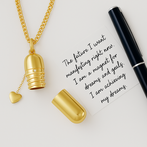 The Manifestation Capsule Necklace works by allowing you to write your intention on a small scroll, which you then insert into the pendant. Simply twist open the capsule, place your written manifestation inside, and twist it closed again.